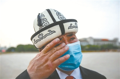 近日,阿布都加帕尔·猛德在天安门广场观看升旗仪式,流下激动的眼泪。 (图片来源:新京报客户端)